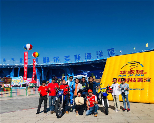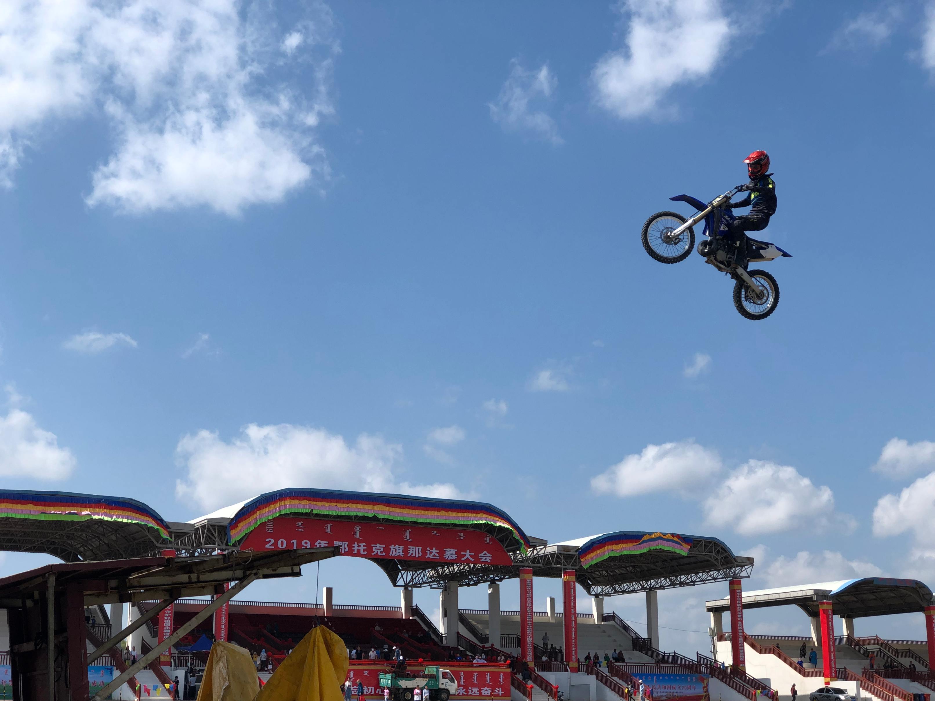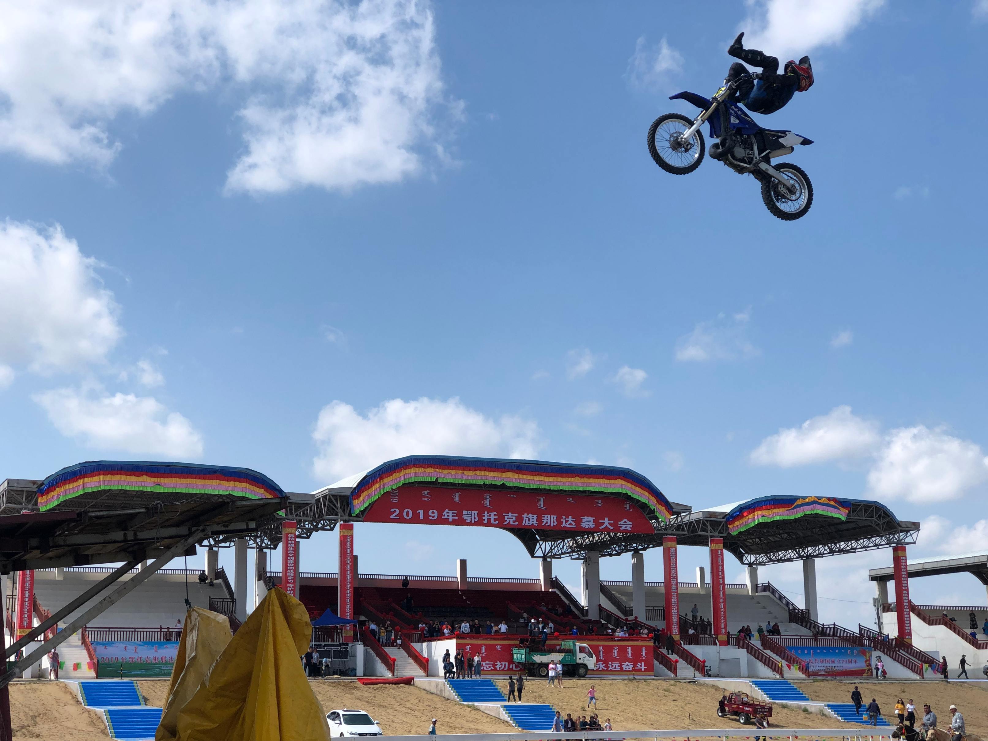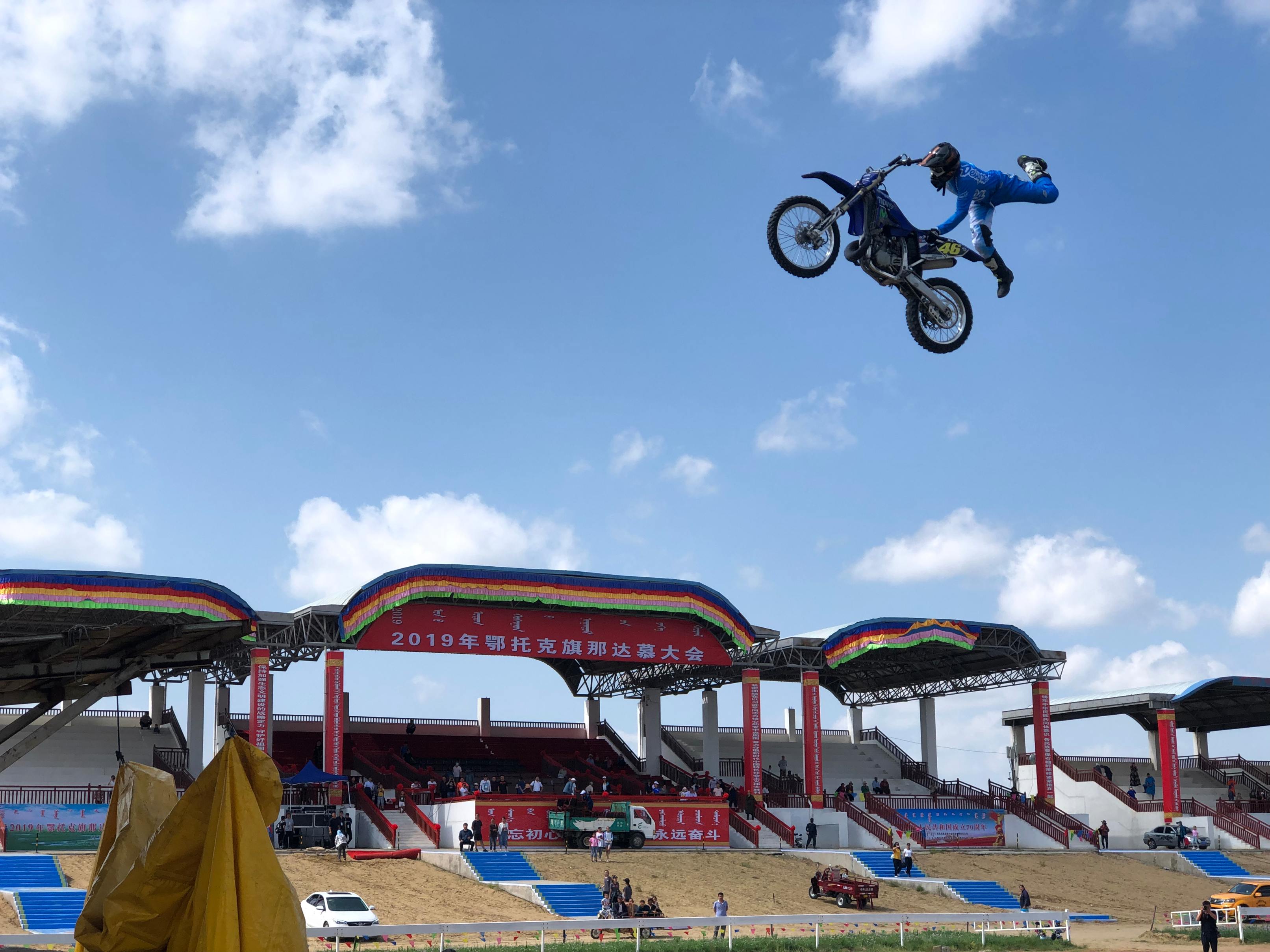 為慶祝中華人民共和國成立70周年,進一步弘揚和傳承全旗優(yōu)秀民族文化,挖掘時代價值,凝聚磅礴愛國力量,豐富各族人民群眾精神文化生活,結(jié)合“中國農(nóng)民豐收節(jié)”,繼承和弘揚民族慶豐收傳統(tǒng),深入開展獨具地方特色、主題鮮明的群眾性文化體育活動和新時代精神文明創(chuàng)建活動,進一步激發(fā)全旗各族干部群眾熱愛黨熱愛祖國熱愛家鄉(xiāng)的深切情懷,全面提升廣大人民群眾榮譽感、幸福感、獲得感,8月5號上午,2019年鄂托克旗那達慕大會在全民健身廣場盛大開幕。開幕式現(xiàn)場文體表演中,邀請華家班超級戰(zhàn)隊登陸我旗進行摩托車空中花式表演秀,吸引了現(xiàn)場所有觀眾的眼球,他們?yōu)楝F(xiàn)場觀眾上演“叩擊”“神龍擺尾”、“空中360度旋轉(zhuǎn)”“空中剪刀腳”“倒掛金鉤”等多項高難度動作,一場驚險刺激的視覺盛宴贏得了陣陣掌聲和喝彩聲。